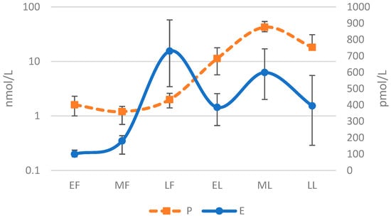 Median and Interquartile Levels for Estrogen and Progesterone Across Six Phase Menstrual Cycle []. Early Follicular (EF); Mid Follicular (MF); Late Follicular (LF); Early Luteal (EL); Mid Luteal (ML); Late Luteal (LL); Progesterone (P); Estrogen (E). Log-10 applied to y-axis and demonstrates a sinusoidal wave pattern.