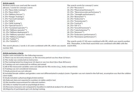 The screening of articles for potential relevance was first determined based on the title of the article, and second, on the abstract. Articles consisting of data from strenuous military training or operations/deployment and measuring metabolic, endocrinological, or physical performance factors before, during, and after strenuous military training or operations were included. Of the abstract-screened and included articles, full texts were obtained and read.