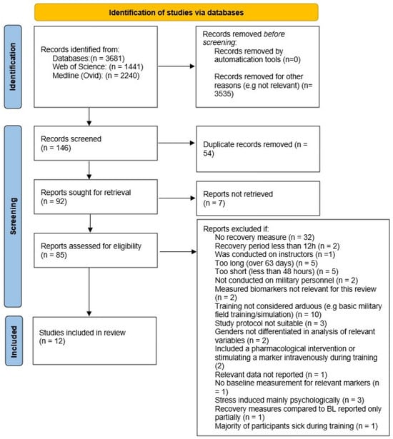 The literature search conducted on both databases yielded an overall number of 3681 results. Following abstract screening, 146 records were included for full-text review. Of these, 54 duplicates were removed. Thus, 92 reports were sought for retrieval (for 7 articles, the full text could not be retrieved). Therefore, 85 reports were assessed for eligibility in the full-text screening. Following the full-text screening, 12 studies were included in the review. Reasons for exclusion following the full-text screening are presented in the PRISMA flow diagram (Figure 2).
