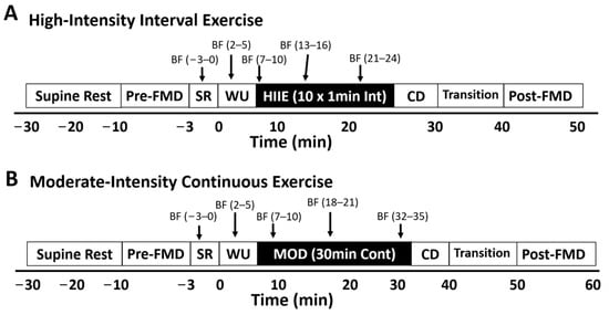 Shear stress has been measured via ultrasound assessment during exercise in a handful of studies [19,20,21,22,23,24,25,26]. To our knowledge, no study has directly compared high-intensity interval exercise (HIIE) and moderate-intensity continuous exercise (MOD) during-exercise blood flow of a single bout of exercise. However, various intensities for continuous exercise have been evaluated [20] and it seems anterograde shear rate increases concomitantly with exercise intensity, with a possible plateau around 70% of maximum heart rate (HRmax). These findings from Birk et al. [20] potentially offer further insight into during-exercise shear rate between these two popular exercise protocols. Specifically, as exercise intensity increases, shear rate increases, but possibly only to a certain % of maximum heart rate. Furthermore, no study has compared the acute effects of HIIE and MOD on FMD, low-flow mediated constriction (L-FMC), and the composite endpoint of vascular reactivity (COM). Therefore, we aimed to compare the brachial artery blood flow characteristics during and after HIIE and MOD.