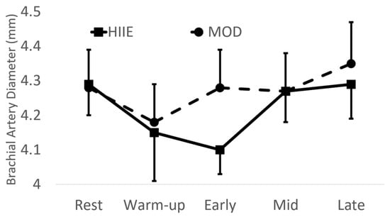 Brachial artery diameter before and during exercise. Mean ± SD; HIIE: high-intensity interval exercise; MOD: moderate-intensity continuous exercise.