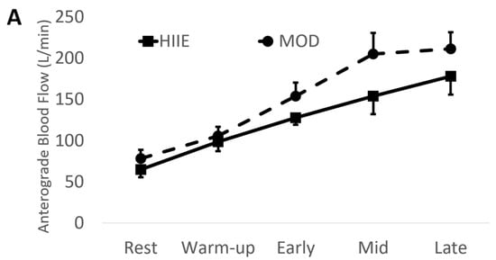 Simmons et al. [24] showed that brachial artery anterograde blood flow increased during a single bout of continuous exercise as skin temperature increased. Our data also show an increase in anterograde blood flow from warm-up throughout each stage of exercise in both MOD and HIIE, but HIIE was still lower than MOD, suggesting a unique effect of HIIE on blood flow in the brachial artery. Simmons et al. [24] showed a significant vasoconstriction of the brachial artery at the onset of exercise leading to higher retrograde blood flow and shear rate. Our study and Padilla et al. [23] also show vasoconstriction at exercise onset, although not significant, which most likely leads to the immediate increase (more negative) in retrograde shear rate (See Figure 3D). Our study and others [23,24] show that this increased retrograde shear rate slowly dissipates as exercise continues. Uniquely, our study shows that the retrograde shear rate did not dissipate as quickly in HIIE as it did in MOD (see Figure 3D), which may be partially due to the artery diameter difference (~4%, not significant) between HIIE and MOD during the “early” phase of exercise.