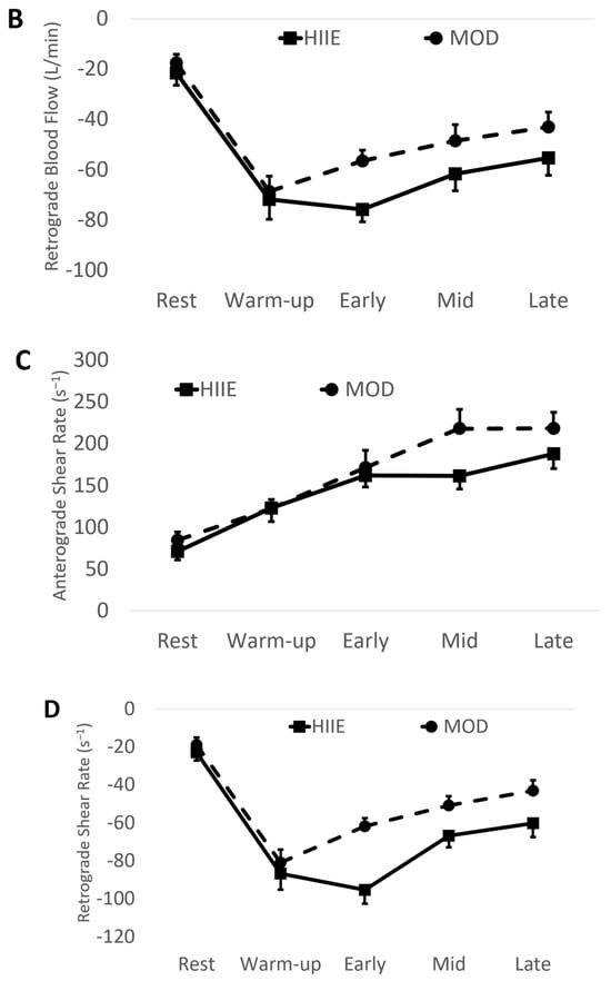 Conversely, retrograde velocity, blood flow, and shear rate were of greater magnitude during HIIE compared to MOD (See Figure 3).