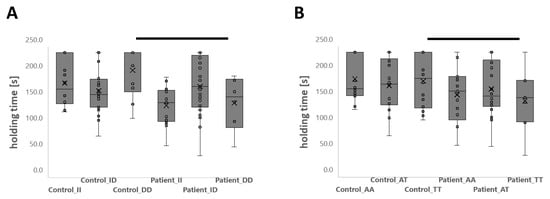 The variability of the holding time demonstrated a complex interaction of the ‘study group’ with the rs1799752 genotype (p = 0.005). Therefore, the holding time was shorter in patients than controls for the DD-genotype (−61.6 s) and tended to be shorter for the II-genotype (−39.8 s, p = 0.071) but not the ID-genotype (p = 0.751; Figure 1). For the patients, only some ID genotypes completed the 4 min cap of the isometric endurance test, differing from the frequency observed for II and DD genotypes (p = 0.020, Chi2-test).