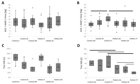 Genotype x group interactions for cardiovascular strain during and recovery of tHb after the isometric lumbar endurance test. Box-whisker plots of the average increase in MAP (AUC ΔMAP/time; (A,B) and Trec for tHb after (C,D) the isometric endurance test of lumbar muscles as a function of the rs1799752 (A,C) or rs2104772 (B,D) polymorphism in patients and matched controls. ANOVA with post hoc differences with a test of least significant difference. Thin and thick bars connect differences that met a significance level of p < 0.05 and <0.01, respectively.