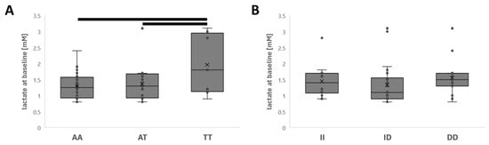 Effects of genotype on blood lactate concentration. Box whisker plots of the baseline blood lactate concentration before the Biering-Sørensen test for the rs2104772 (A) and rs1799752 genotypes (B). Bars connect differences that met a significance level of p < 0.01.