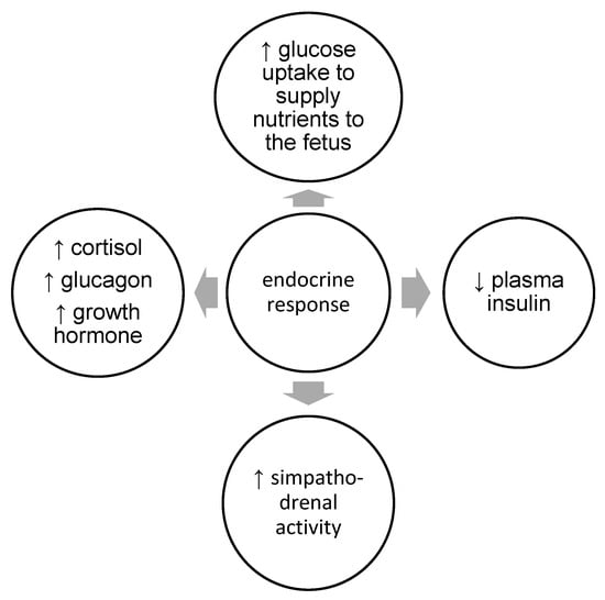 The endocrine system regulates, connects, and coordinates various physiological processes and thus ensures the long-term homeostasis of the organism [3,4,5]. At the same time, together with the nervous system, it supervises the regulation of all functions in the body. Through mutual interaction, these systems connect individual parts of the organism into a functional whole. The impact of the nervous system on the endocrine system can be direct (it affects directly a certain gland) or indirect (it affects certain glands via the pituitary gland, the main gland of the endocrine system) [5,6,7,8,9,10]. On the other hand, the function of the nervous system is significantly influenced by the products of the endocrine system [6,7]. The endocrine and nervous systems are responsible for regulating the speed of chemical processes, the transport of substances, the relationship between water and electrolytes, growth, development, and numerous other physiological processes [8,9,10,11,12]. Therefore, it can be said that the work of the two main control systems is interdependent, and their coordinated function is necessary for physiological processes during exercise [13]. The endocrine system, as a system of glands with internal secretion, secretes its products (hormones) directly into the bloodstream, thus regulating numerous metabolic processes, especially during exercise [14,15,16,17]. Lipid metabolism is the initial source of energy at low exercise intensities (<40% VO2 max) [4]. By increasing the intensity of exercise, circulating glucose metabolism is enhanced, and in pregnancy, the concentration of glucose in the circulation can drop up to 31% [4]. But, compared to nonpregnant women, insulin remains elevated in pregnant women during exercise. This can carry on, encouraging the transfer of glucose to the fetus [4,13,15]. The perception of improved glucose clearance and reduced hyperinsulinemia with exercise appears to be a mechanism by which the risk of developing gestational diabetes can be reduced [4,14]. Also, exercise performed during pregnancy reduces the risk of gestational diabetes-related complications, notably macrosomia [5,13,15].