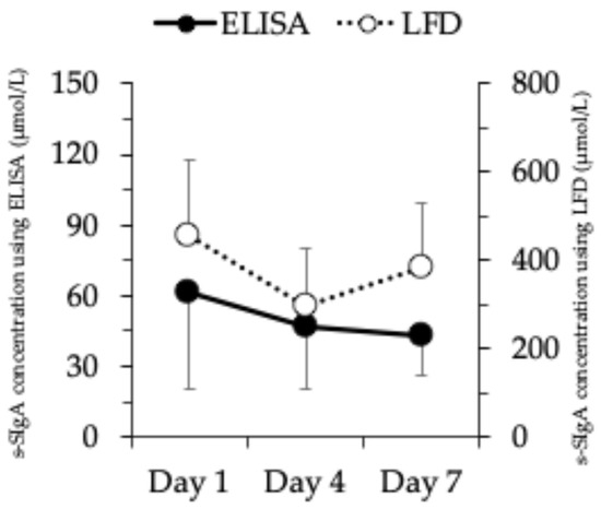 Figure 1 shows the changes in s-SIgA concentrations quantified using the ELISA and LFD. Both the ELISA and LFD s-SIgA concentrations were significantly lower on days 4 and 7 than on day 1.