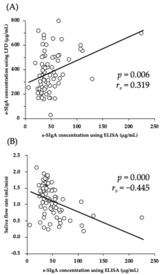 Univariate correlations between s-SIgA concentration determined via ELISA and s-SIgA concentration determined using (A) LFD and (B) saliva flow rate. ELISA: enzyme-linked immunosorbent assay; LFD: lateral flow device; s-SIgA: salivary secretory immunoglobulin A.