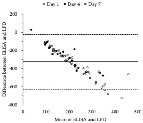 Figure 3 shows the results of the Bland–Altman plot. The average difference in s-SIgA concentrations between the ELISA and LFD method was −327 µg/mL, and the limit of agreement ranged from −630 to −23 µg/mL. The 95% confidence interval ranged from −363 to −290 µg/mL, with a fixed error (p < 0.01) and proportional error (p < 0.01) in s-SIgA concentrations determined by the ELISA and LFD.