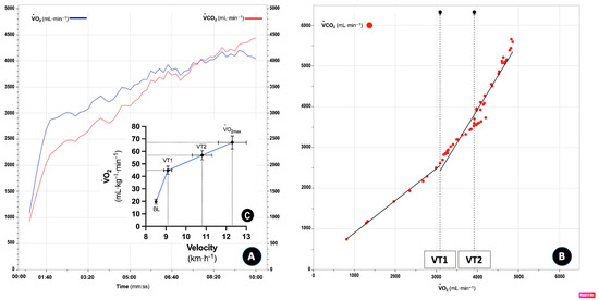 Plots from a representative participant showing O2 (solid blue) and CO2 (solid red) vs. time during a 20-m SRT (Panel (A)), and ventilatory thresholds VT1 and VT2 (Panel (B)); Panel (C) shows mean values and standard deviations for O2 (solid blue) at VT1, O at VT2 and O2max, and respective velocities during the 20-m shuttle run test (20-m SRT; n = 10).