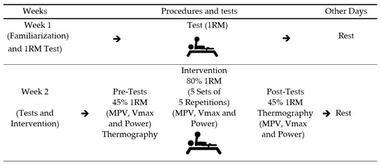 Descriptive statistics were performed considering measures of central tendency, mean ± standard deviation (X ± SD), and a 95% confidence interval (95% CI). The Shapiro–Wilk test was used to verify the normality of the variables, given the sample size. A two-way repeated measures ANOVA was conducted to evaluate differences between PP and CP and the moments, as well as a Bonferroni post-hoc tests [21]. The temperature and dynamic strength indicators were evaluated with 45% of 1RM before and after the intervention. With a load of 80% of 1RM, the dynamic strength indicators were evaluated in the first and last series. In the variables in which differences between PP and CP were previously demonstrated, the ANCOVA test was then used, where the discrepant value was adopted as a covariate. Statistical analysis was performed using the Statistical Package for the Social Sciences (SPSS 25.0) (IBM, New York, NY, USA). The adopted significance level was p < 0.05. η2p = partial eta squared (small effect ≤0.05, medium effect 0.05 to 0.25, large effect 0.25 to 0.50, and very large effect > 0.50) [22,23].