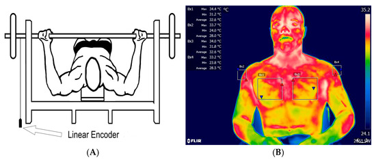 Infrared thermography was employed to record athletes’ skin temperature. Subjects were instructed to remain seated and as calm as possible to avoid affecting readings. Athletes were advised to refrain from any physical activity 48 h before testing and to abstain from caffeine, stimulants, or alcohol consumption. Participants were instructed to avoid intense physical activity in the 24 h prior to the assessment, as well as the consumption of alcohol or caffeine. In addition, they were advised not to use creams or lotions on their skin in the 6 h prior to the procedure. To obtain the thermograms, the athlete remained seated, avoiding sudden movements, keeping their arms uncrossed, and refraining from scratching for at least 10 min, ensuring the acclimatization process [16,23]. Tests were conducted in a controlled environment with ambient temperature ranging between 22 °C and 24 °C and relative humidity around 50%, as recorded by a Hikari HTH-240 thermo-hygrometer (Hikari, Shenzhen, China) [24]. A FLIR T640sc thermal imaging camera (FLIR, Stockholm, Sweden) was utilized, featuring a temperature range of −40 °C to 2000 °C, accuracy of 2%, sensitivity of <0.035, infrared spectral band of 7.5–14 µm, refresh rate of 30 Hz, and resolution of 640 × 480 pixels [20]. Thermal images of the clavicular region of the pectoralis major muscle and the long head of the triceps brachii were captured (Figure 2B), and the attachment of the linear encoder to the bar is also graphically represented (Figure 2A).