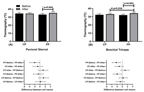 Skin temperature in the long head of the triceps brachii (TB) and sternal portion of the pectoral major (PM) muscles showed significant alterations in both groups. Infrared thermography in sports has been used to understand thermal changes in muscle tissue after exercise or training, providing data for a better understanding of injury prevention, biomechanical alterations, and imbalances [16,25]. In the sternal portion of the pectoralis major and in the triceps brachii, differences were observed between the time before and after in the PP athletes. In the triceps brachii, a difference was observed between the time after between the PP and the CP athletes. However, the temperature difference of less than 0.4 °C does not present a risk of injury for any of the athletes.