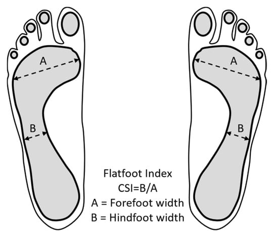 - Chang, C.H.; Chen, Y.C.; Yang, W.T.; Ho, P.C.; Hwang, A.W.; Chen, C.H.; Chang, J.H.; Chang, L.W. Flatfoot diagnosis by a unique bimodal distribution of footprint index in children. PLoS ONE 2014, 9, e115808. [Google Scholar] [CrossRef]