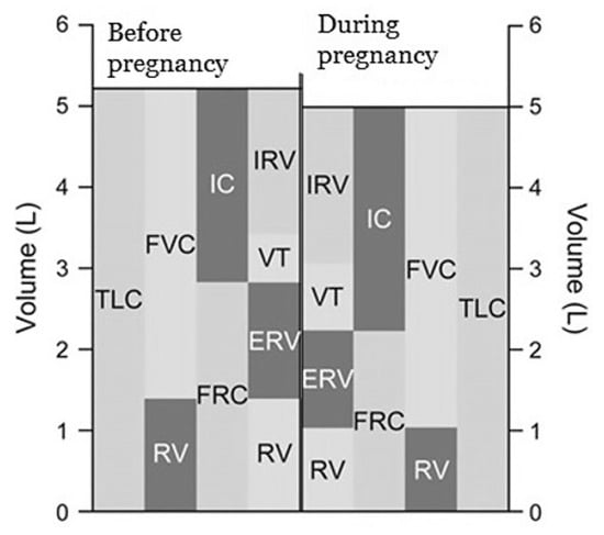 In contrast, inspiratory capacity (IC) increases by 5% to 10% and total lung capacity (TLC) remains unchanged or decreases slightly (less than 5%) in the near term during pregnancy [5,9,21]. Figure 2 presents changes in respiratory volumes and capacities before and during pregnancy.