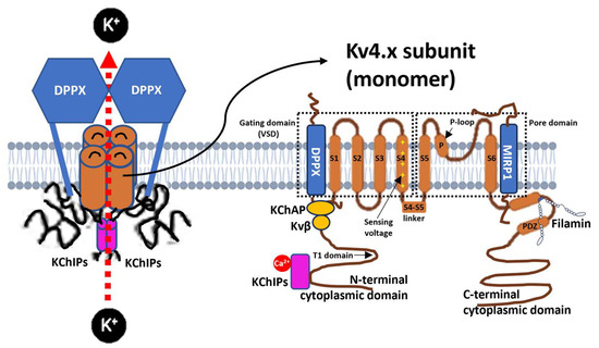 Ion channels are macromolecular complexes present in the plasma membrane and in intracellular organelles of all cells, participating in essential functions such as the preservation of cellular integrity, smooth muscle contraction, and the release of neurotransmitters and hormones [1]. Alterations in channel structure, function, gating, or expression give rise to channelopathies, which represent a challenge for research and therapeutic development [2,3]. This review focuses on voltage-gated potassium (Kv) channels, particularly the Kv4 or Shal subfamily, formed by Kv4.1 (KCND1), Kv4.2 (KCND2) and two splice variants of Kv4.3 (KCND3), with ~60% sequence identity [2,3]. Kv4.x channels are expressed mainly in brain, heart and muscle, where they generate transient potassium ion (K+) currents, known as the transient outward K+ current (Ito) in the heart and the transient A-type current (Ia, or also referred as IKA and IA) in neurons, with Ito and Ia being different names for the same current depending on the tissue context [4]. Thus, Kv4 channels are responsible for the outward movement of K+, which contributes to the generation of a transient outward current.