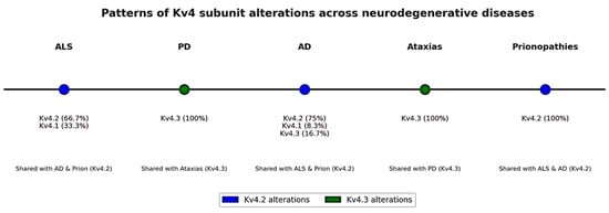 Schematic representation of Kv4 subunit alterations across neurodegenerative disease groups. The timeline illustrates the predominant alterations reported in Table 2, highlighting both shared and disease-specific patterns. Kv4.2 dysfunction is common to Alzheimer’s disease (AD), amyotrophic lateral sclerosis (ALS), and prionopathies, whereas Kv4.3 alterations predominate in spinocerebellar ataxias (SCA/EA) and Parkinson’s disease (PD). Kv4.1 involvement was rare and restricted to isolated studies in ALS and AD. Percentages indicate the proportion of studies reporting alterations within each disease group.
