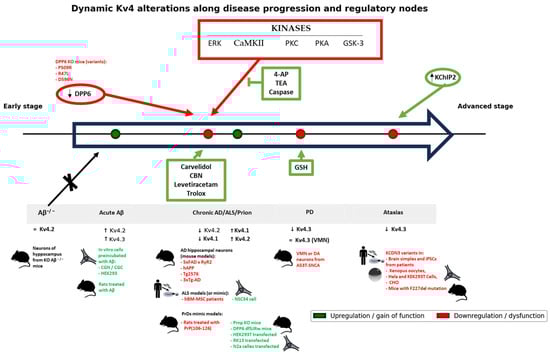 Dynamic Kv4 alterations along disease progression and regulatory nodes. The timeline depicts changes in Kv4 subunits across neurodegenerative disease models: upregulation/gain of function (green) and downregulation/dysfunction (red). Acute Aβ exposure transiently enhances Kv4.2 and Kv4.3 currents, whereas chronic AD, ALS, and prion models consistently show Kv4.2 downregulation. PD and ataxias primarily involve Kv4.3 dysfunction (KCND3 mutations). Regulatory nodes include auxiliary subunits (DPP6 deficient, KChIP2 coexpression) and kinases (ERK, CaMKII, PKC, PKA, GSK-3). Pharmacological interventions (levetiracetam, carvedilol, cannabinoids, Trolox, GSH, 4-AP, TEA) are shown to partially rescue Kv4 currents or expression. Icons indicate experimental models, including mouse transgenics, patient-derived cells, and in vitro preparations. 4-AP, 4-aminopyridine. Aβ, amyloid-β peptide. AD, Alzheimer’s disease. ALS, amyotrophic lateral sclerosis. APP, amyloid precursor protein. CaMKII, Ca2+/calmodulin-dependent protein kinase II. CBN, cannabidiol. CGC, cerebellar granule cells. CGN, cerebellar granule neurons. DA, dopaminergic neurons. DPP6, dipeptidyl-peptidase-like protein-6. ERK, extracellular signal-regulated kinase. GSH, glutathione. GSK-3, glycogen synthase kinase-3. iPSC, induced pluripotent stem cells. KChIP2, Kv channel-interacting protein 2. PD, Parkinson’s disease. PKA, protein kinase A. PKC, protein kinase C. PrDs, prion diseases. PSEN1, presenilin-1. SCA, spinocerebellar ataxia. TEA, tetraethylammonium. VMN, vagus motor neurons. Arrows: red arrows indicate downregulation/dysfunction pathways; green arrows indicate rescue or protective interventions. Symbols: ↑, upregulation or gain of function. ↓, downregulation or loss of function. =, no change.