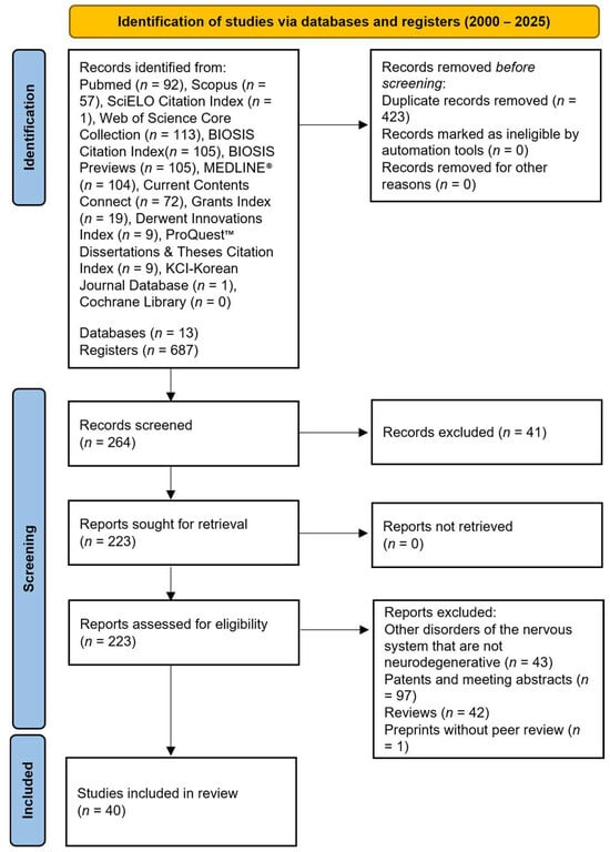 This review focuses exclusively on neurodegenerative diseases of the CNS, excluding other CNS disorders such as neurodevelopmental or mental illnesses, trauma, epilepsy, neoplasia, or infectious diseases. Identification of studies was carried out through a multiengine literature search of the PubMed, Scopus, SciELO Citation Index, Web of Science Core Collection, Biosis Citation Index, Biosis Previews, Medline, Current Contents Connect, Grants Index, Derwent Innovations Index, ProQuest Dissertations & Theses Citation Index, KCI-Korean Journal Database, and Cochrane Library databases by 3 independent researchers (S.G.-A., N.S.-M., and G.D.-V.). The review was registered in PROSPERO with ID: CRD420251119426. The following search strategy was used to identify potentially eligible studies and was adapted to the different databases consulted: (Potassium Channel AND ((Kv4.1 OR KCND1) OR (Kv4.2 OR KCND2) OR (Kv4.3 OR KCND3)) AND ((amyotrophic lateral sclerosis OR ALS) OR Parkinson OR Alzheimer OR Huntington OR Ataxia* OR dementia* OR (Central Nervous System Diseases) NOT Neoplasms)). All potentially eligible studies were retrieved, and their bibliographies were manually searched for additional studies. Only available full-text articles written in English or Spanish and published from January 1, 2000, to the date of PROSPERO registration (4 August 2025) were included. Studies evaluating human participants with neurodegenerative disorders of the central nervous system in which variants in KCND1, KCND2, or KCND3 (potassium channels Kv4.1–4.3) were identified, providing clinical, genetic, or functional data, were included. Functional or genetic analyses of these variants were considered, including humanized cellular or animal models carrying human mutations. Studies on other channels or variants unrelated to neurodegeneration, research in non-humanized models, review and meta-analyses articles, unreviewed preprints, in silico predictions without experimental validation, incomplete articles, data published only in abstract form, duplicate studies or written in another language that is not part of the inclusion requirements were excluded. Comparators included healthy individuals, wild-type models, or humanized models without pathogenic variants. Observational and interventional studies evaluating Kv4 channel function and their clinical impact were included. The research question was formulated following PICO: population (patients with variants in KCND1–3), intervention/exposure (functional or genetic analysis), comparator (healthy individuals or humanized models without variants) and outcomes (impact on Kv4 function and clinical phenotypes). Preferred reporting items for systematic reviews and meta-analyses (PRISMA) guidelines were followed for the methodology used in the study [129]. The detailed screening protocol for the studies is depicted in Figure 4.