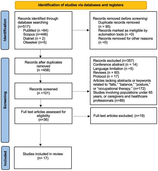 On the other hand, the exclusion criteria included the following: (a) interventions based primarily on pharmacology, nutritional supplementation, physiotherapy, podiatry, or medicine; (b) studies involving populations under 65 years, or caregivers and healthcare professionals; (c) animal studies or protocol-only articles without published results; (d) systematic reviews or meta-analyses; and (e) articles lacking abstracts or keywords related to “falls,” “balance,” “posture,” or “occupational therapy.”