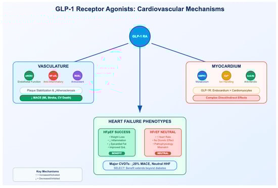 While the clinical efficacy of GLP-1 RAs is now firmly established, a complete understanding of how these agents exert their profound cardioprotective effects requires a deeper exploration of their underlying physiological mechanisms. The purpose of this review is to synthesize the current state of knowledge, moving beyond the macro-level outcomes of clinical trials to the micro-level cellular and molecular pathways. This paper will systematically deconstruct the multifaceted actions of GLP-1 RAs, beginning with their effects on the vasculature and the pathogenesis of atherosclerosis. It will then navigate the complex and often controversial evidence regarding their direct and indirect effects on the myocardium. A central theme will be the analysis of their dichotomous role in heart failure, clarifying their established benefits in heart failure with preserved ejection fraction (HFpEF) and their contrasting neutrality or potential for harm in heart failure with reduced ejection fraction (HFrEF). By addressing key controversies, such as the precise cellular location of the GLP-1 receptor in the human heart, this review aims to provide a comprehensive physiological framework and identify critical unanswered questions that will shape the future of cardiometabolic medicine []. Unlike previous reviews that focus on individual aspects, this comprehensive analysis uniquely integrates vascular, myocardial, and heart failure phenotype mechanisms to provide a complete physiological framework for understanding GLP-1 RA cardiovascular effects, displayed in Figure 1.