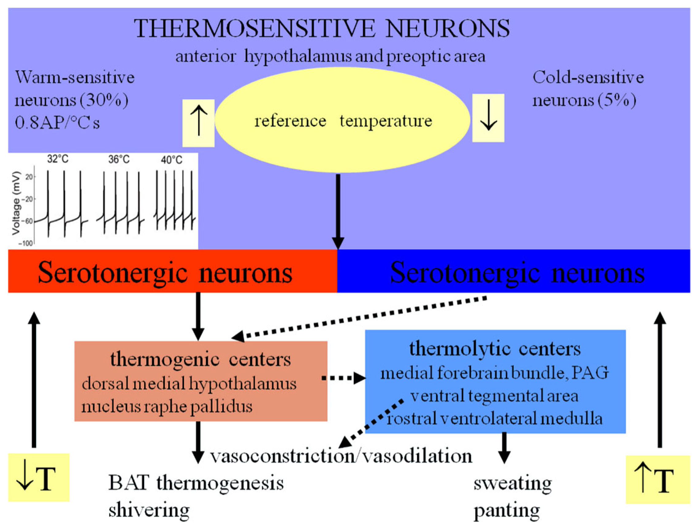- Boulant, J.A. Role of the preoptic-anterior hypothalamus in thermoregulation and fever. Clin. Infect. Dis. 2000, 31 (Suppl. 5), S157–S161. [Google Scholar] [CrossRef] [PubMed]