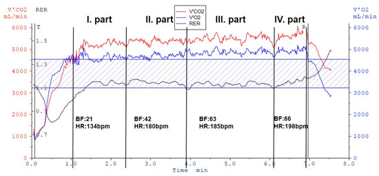 This represents one of the most demanding challenges for human physiology, primarily for the oxygen transport system, i.e., the transport of oxygen from the ambient air to the working muscles. During the standard spiroergometry test, the rowing ergometer was set up in a special room. The temperature (approx. 16–22 °C), humidity (30–60%) and ventilation of the room were controlled. The extreme effort associated with rowing can be explained by the seated posture and the simultaneous intensive use of the upper and lower limbs, which together increase cardiac output [22].