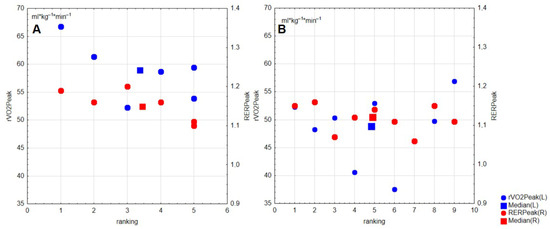 /A/B Rankings based on rowing ergometer test (2000 m), by gender. Legend: The figure marked (A) shows the results for males, while the figure marked (B) shows the results for females. The blue squares show the median values of relative aerobic capacity (rVO2), (left y-axis), while the red squares show the median values of respiratory exchange ratios (RERpeak), (right y-axis). The blue and red full circles represent the individual averages of the two characteristics indicated above. The horizontal axis (x-axis) shows the order of the competitors participating in the test, (A) (1–5), (B) (1–9).