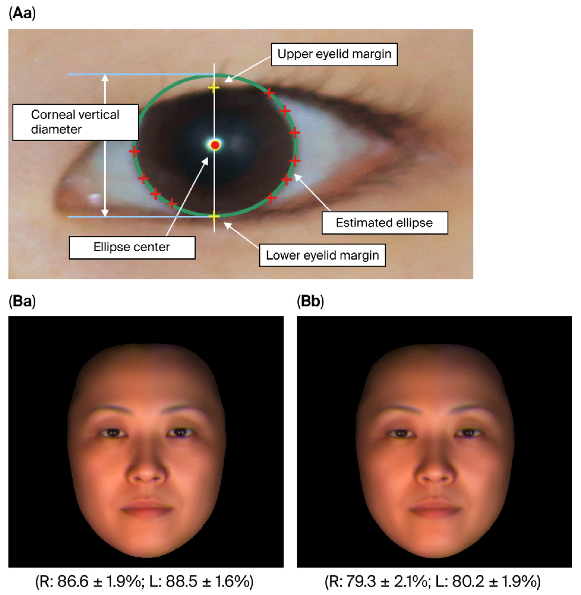 Figure 1. Method for calculating the degree of eye-opening and example comparison. (Aa): The degree of eye-opening was calculated as follows: ten arbitrary points were designated along the edge of the cornea. Based on known data for Japanese individuals (corneal horizontal diameter/corneal vertical diameter = 11.5/10.5) and using a curve fitting method, the corneal center, horizontal diameter, and vertical diameter were estimated from these points. A coordinate system was then established with the corneal center as the origin. In this system, the Y coordinates of the upper eyelid margin and corneal submargin were recorded, and the degree of eye-opening was calculated using the following formula: degree of eye-opening (%) = (upper eyelid margin Y coordinate—corneal submargin Y coordinate)/corneal vertical diameter × 100. (B): Comparative example of eye-opening degree (average face of all participants). We measured the degree of eye-opening (%) (mean ± SEM) from facial images of 25 female nurses taken (Ba) after a day off and (Bb) after a night shift. R, right eye; L, left eye.