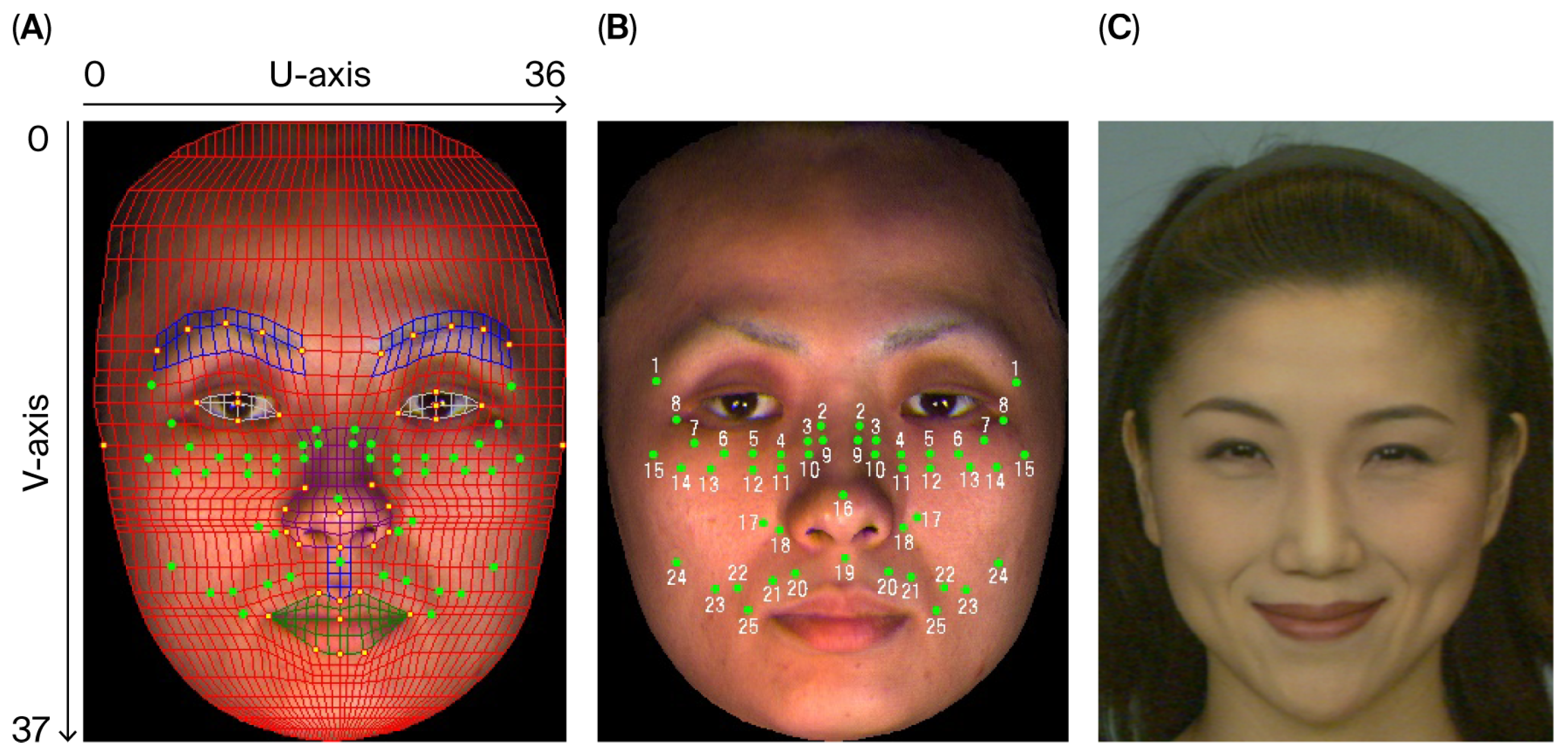 Figure 2. Outline of the motion capture method. (A): To facilitate measurement, a face wireframe was applied to a neutral facial image, with markers (green circles) positioned based on representative grid points, totaling 25 points on each side of the face. While individual facial images were used in actual measurements, this diagram illustrates the markers on an averaged face for the 25 participants. (B): The face wireframe has been removed from the marker placement diagram in (A). (C): Still image of an intentional smiling expression, which was shown to the participants. The image was purchased from ATR-Promotions (the rights holder of the image). Copyright: ATR-Promotions, republished with permission.