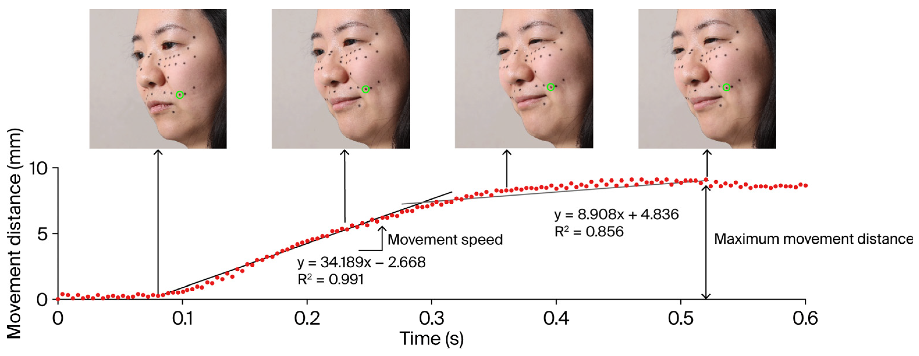 In the selected smiling expression scene, the displacement of facial feature points marked on the skin was automatically tracked using the Center of Gravity method. This approach involved generating an outline by distinguishing brightness differences between white and black areas in the image and tracking the center of gravity. The displacement was calculated using three-dimensional coordinates: x-coordinates indicated left and right movement, y-coordinates indicated up and down movement, and z-coordinates indicated front and back movement relative to the face, with the starting point as the zero reference. Parameters such as MMD, movement speed (MS), and others, as described below, were subsequently analyzed.
