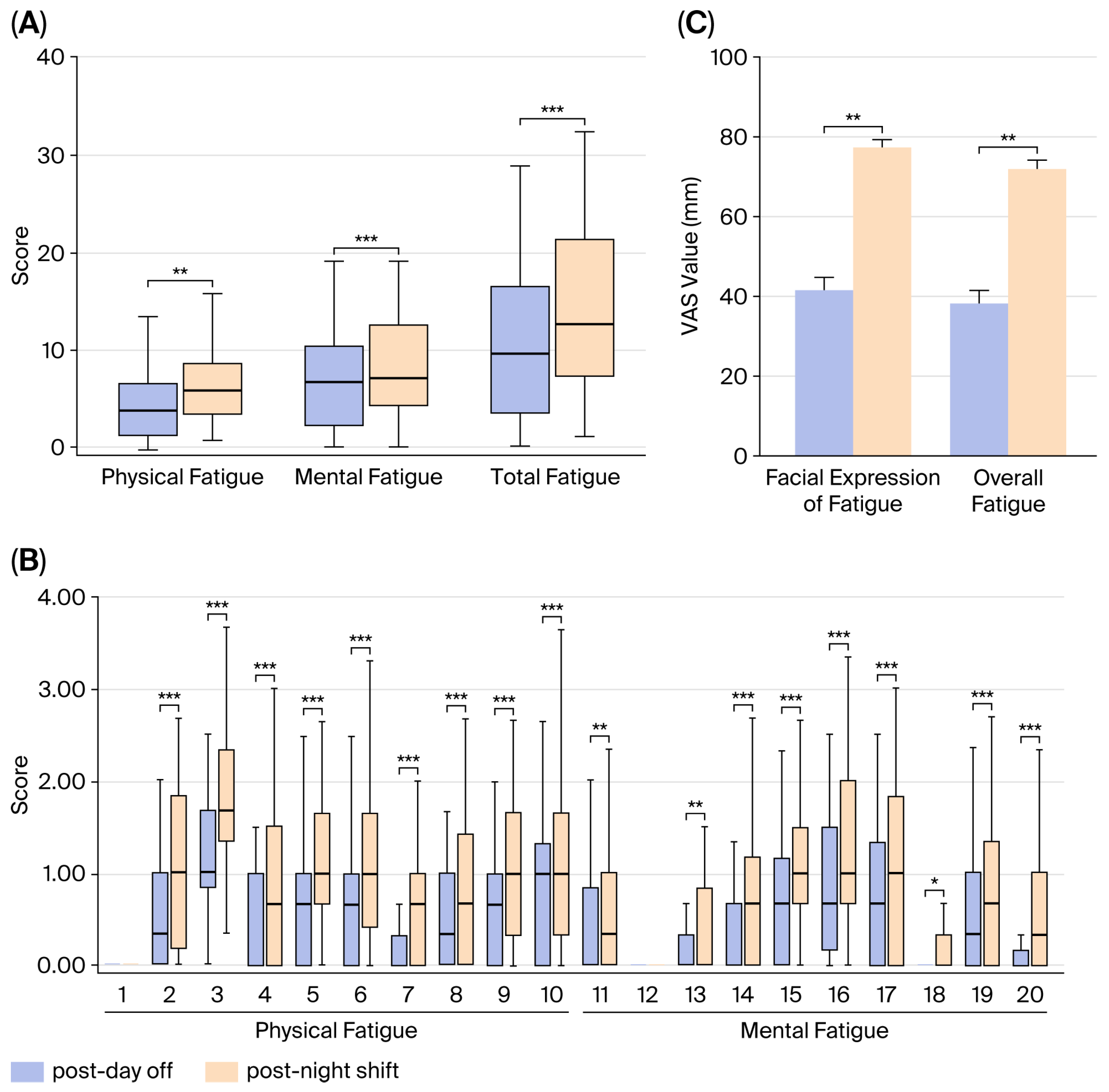 Figure 4. Subjective assessment of fatigue using the self-diagnosis fatigue checklist (A) and VAS (B) in the control and fatigue conditions. (A): A self-diagnosis checklist was used to evaluate fatigue, with total scores of the ten physical and ten mental/psychological symptoms (listed in Table 1) rated on a five-point scale. (B): Evaluation points for each item on the self-diagnosis fatigue checklist. The ten physical symptoms and ten mental/psychological symptoms were evaluated on a five-point scale. (C): VAS assessment of fatigue expression of own faces and overall fatigue. In the data representation, red columns correspond to the control condition (post-day off), and blue columns represent the fatigue condition (post-night shift). Data are presented as the mean ± SEM across 25 subjects. * (p < 0.05), ** (p < 0.01), and *** (p < 0.001) indicate statistically significant differences from the control as determined by Wilcoxon Signed-Rank Test. ** (p < 0.01) indicates a statistically significant difference from the control as determined by a paired t-test.