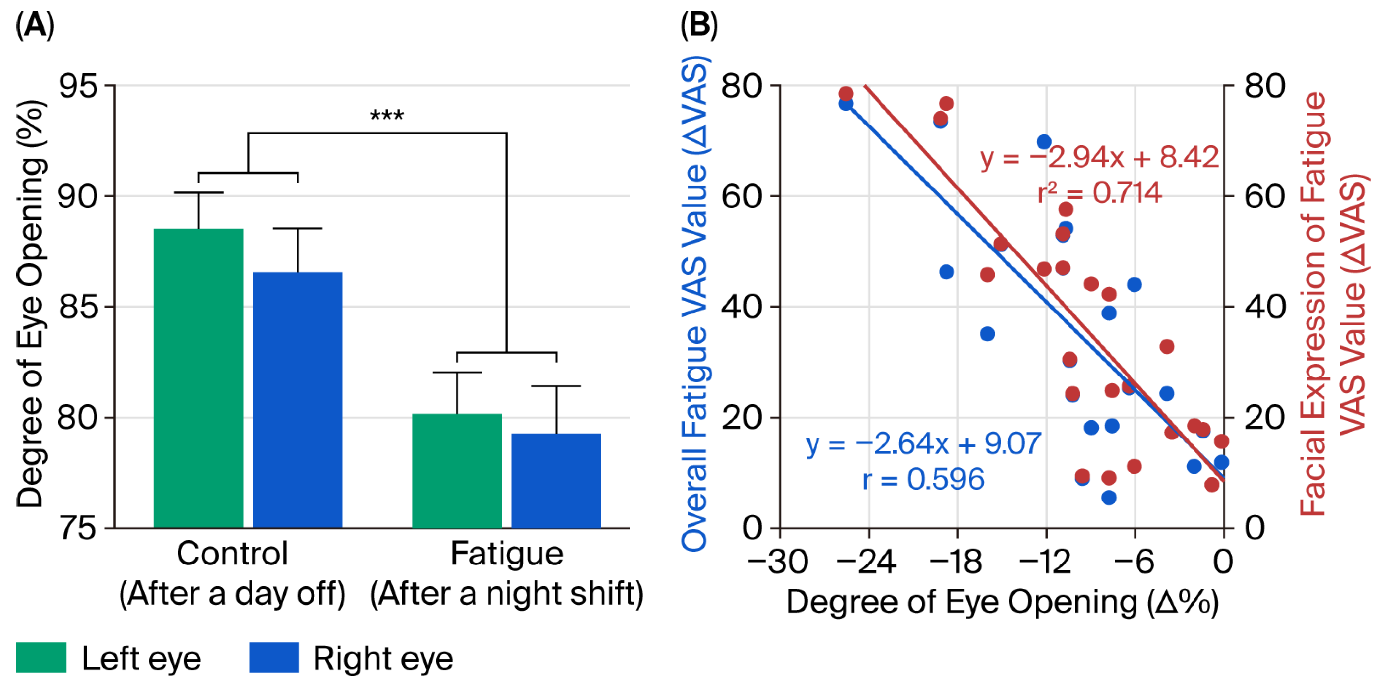 Figure 5. Effects of fatigue state on eye-opening (A) and relationships between subjective (VAS) assessment of fatigue and degree of eye-opening (B). (A): Comparison of the degree of eye-opening based on fatigue state. Photographs of the entire face were taken after a day off (Control) and following a night shift (Fatigue) to calculate the degree of eye-opening. Data represent the mean values of 25 participants ± SEM, with blue columns indicating the right eye and green columns indicating the left eye. Statistically significant differences from the control condition are marked with ***, indicating p < 0.001 (main effect of fatigue state). (B): The relationships between changes in subjective (VAS) assessment of fatigue [changes in VAS assessment of facial expression of fatigue (red circles) and changes in VAS assessment of overall fatigue (blue circles)] and changes in the degree of eye-opening are illustrated. Changes in facial expression of fatigue VAS value (ΔVAS) are calculated by subtracting the facial expression of fatigue VAS value obtained after the day off from the value obtained after the night shift. The change in overall fatigue VAS value (ΔVAS) is obtained by subtracting the overall fatigue VAS value after the day off from the value after the night shift. Changes in the degree of eye-opening (Δ%) are derived by subtracting the degree of eye-opening after the day off from the degree after the night shift. The regression line for the fatigue expression VAS value is y = −2.94x − 8.42, with a coefficient of determination R2 = 0.714. For the overall fatigue VAS value, the regression line is y = −2.64x − 9.07, with a coefficient of determination R2 = 0.59.