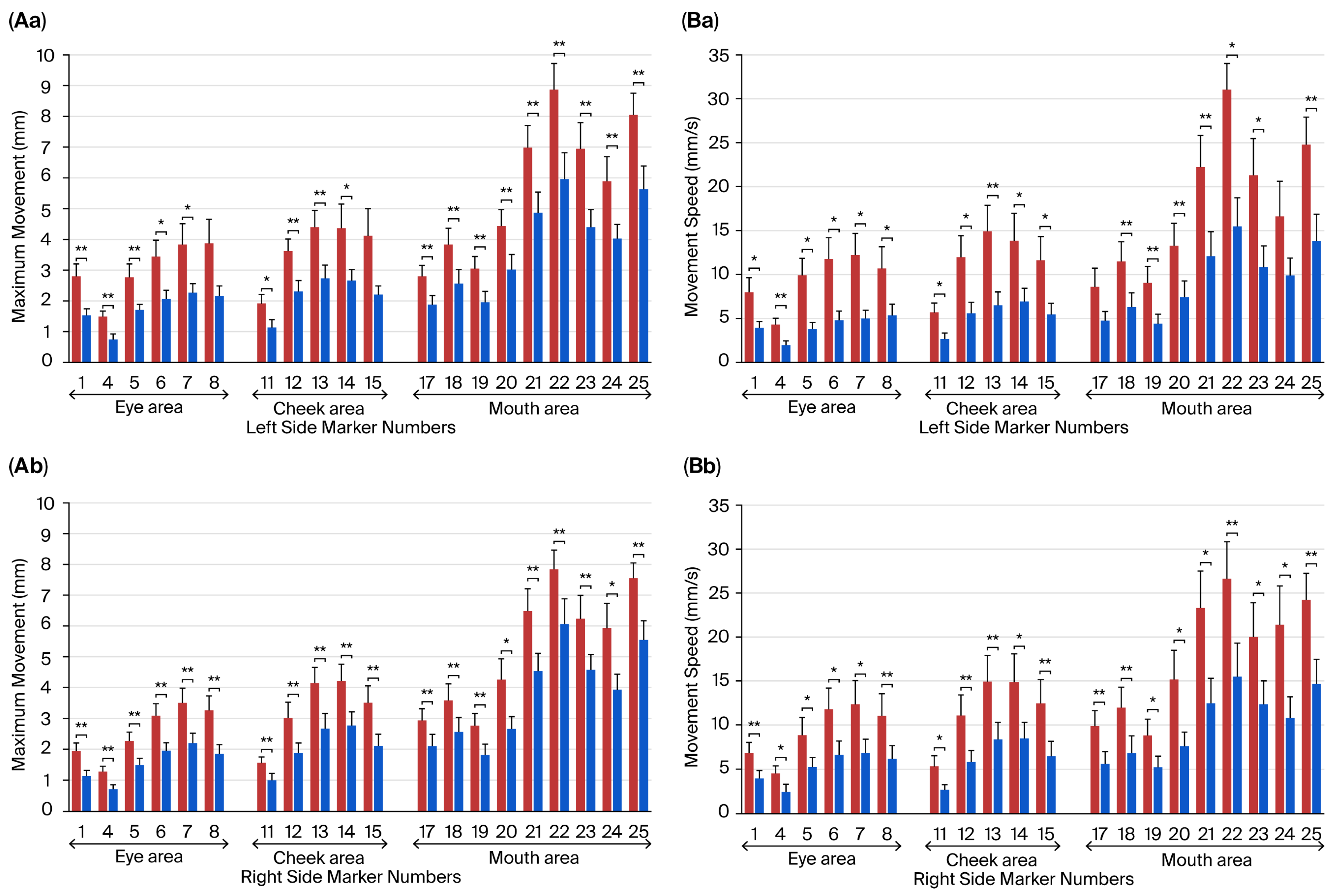 Figure 6. Effect of fatigue states on maximum movement distance and movement speed of each facial part during intentional smiling. (A): Comparison of maximum movement distances of the markers (feature points) on the left side of the face (Aa) and the right side of the face (Ab) when intentionally smiling, depending on the level of fatigue. (B): Comparison of marker movement speed based on fatigue state. (Ba) Movement speed of markers on the left side of the face and (Bb) movement speed of markers on the right side of the face during intentional smiling, reflecting variations due to fatigue levels. Data are presented as mean ± SEM from 25 cases. Red columns represent the control condition (after a day off), while blue columns indicate the fatigue condition (after a night shift). Asterisks (*) and double asterisks (**) signify statistically significant differences compared to the control condition at p < 0.05 and p < 0.01, respectively, as determined by a multiple comparison test using the Bonferroni method. Data for points that did not show a significant difference are not shown here.