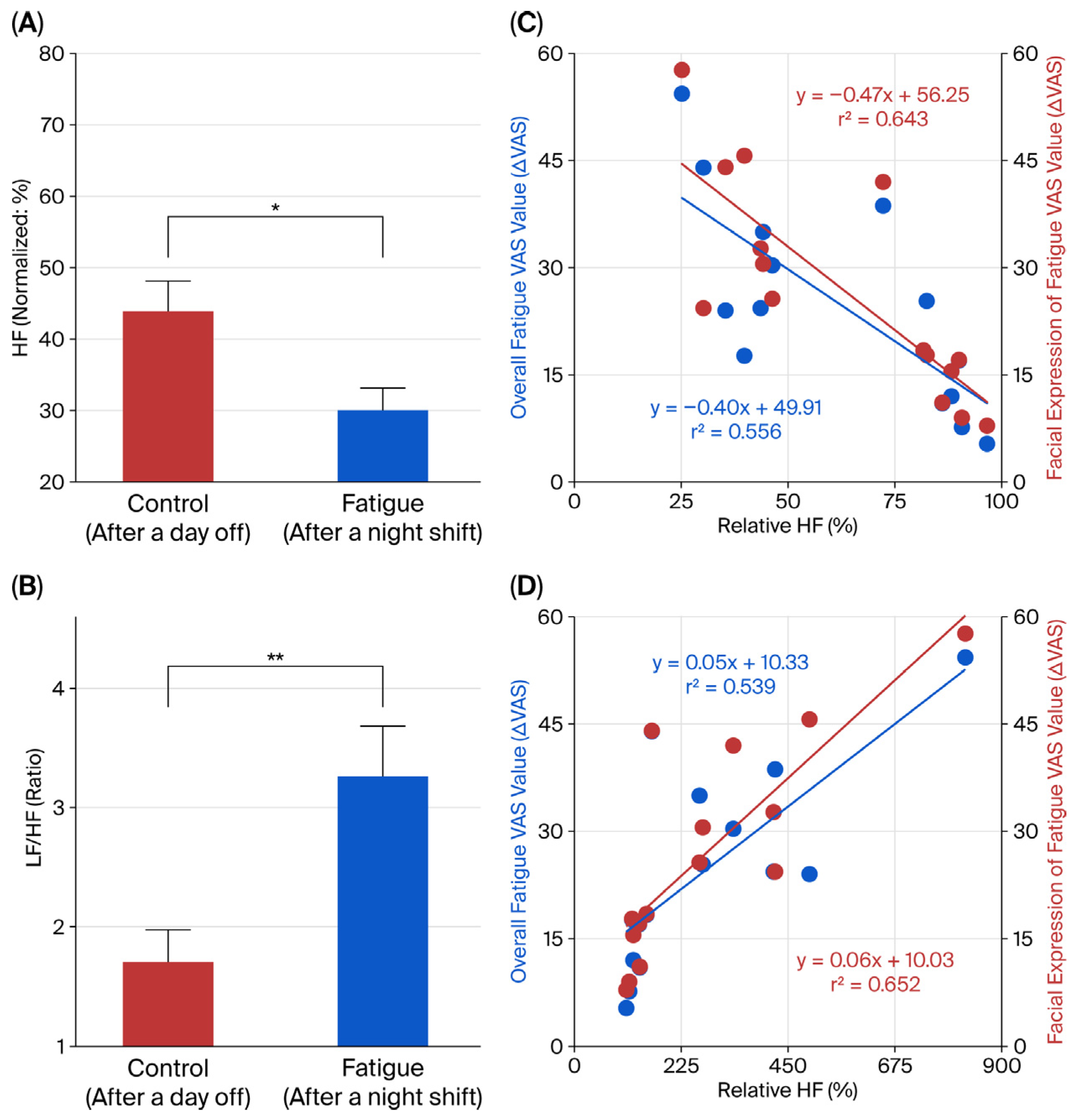 Figure 8. Effect of fatigue states on ECG R-R interval variability spectrum. (A,B): Effect of fatigue states on HF norm (normalized high-frequency component of heart rate variability) (A) and LF/HF (ratio of the low and high-frequency components of the power spectrum of the HR variability) (B). Red columns, control condition (after a day off); Blue columns, fatigue condition (after a night shift). (C): Relationship between changes in subjective (VAS) assessment of fatigue [overall fatigue (blue circles) and facial expression of fatigue (red circles)] and relative HF. Overall fatigue VAS value (ΔVAS), the overall fatigue VAS value after a night shift minus the overall fatigue VAS value after a day off; relative HF (%), {(HF norm after a night shift) × 100}/(HF norm after a day off); facial expression of fatigue VAS value (ΔVAS), the facial expression of fatigue VAS value after a night shift minus the facial expression of fatigue VAS value after a day off. (D): Relationship between changes in subjective (VAS) assessment of fatigue [overall fatigue (blue circles) and facial expression of fatigue (red circles)] and relative LF/HF. Relative LF/HF (%), {(LF/HF after night shift) × 100}/(LF/HF after day off). Data are given as mean ± SEM (n = 15). * and ** indicate statistically significant difference at p < 0.05 and p < 0.01 by paired t-test compared to control.