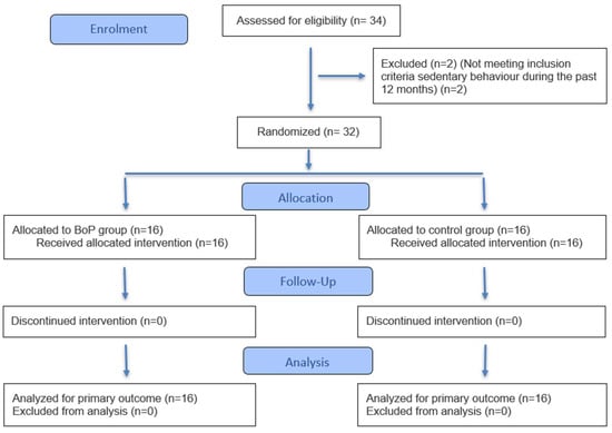 Recruitment took place in January 2025, and participants completed the eight-week intervention and follow-up assessments in March 2025. Participants were randomly allocated into a BoP group (n = 16, 6 men and 10 women, 64.3 ± 5.0 years, 81.3 ± 16.4 kg, BMI 30.6 ± 4.3 kg/m2, SBP 155.9 ± 27.9 mmHg and DBP 83.9 ± 12.1 mmHg) or control group (CG; n = 16, 8 men and 8 women, 65.6 ± 7.7 years, 89.7 ± 16.9 kg, a BMI of 32.1 ± 5.2 kg/m2, SBP of 153.1 ± 7.9 mmHg and a DBP of 92.9 ± 10.3 mmHg), which maintained in parallel their usual lifestyle without participating in any programmed PA (Table 5). BoP attended 3 BoP sessions per week on non-consecutive days (Monday, Wednesday and Friday), each session lasting 45 min.