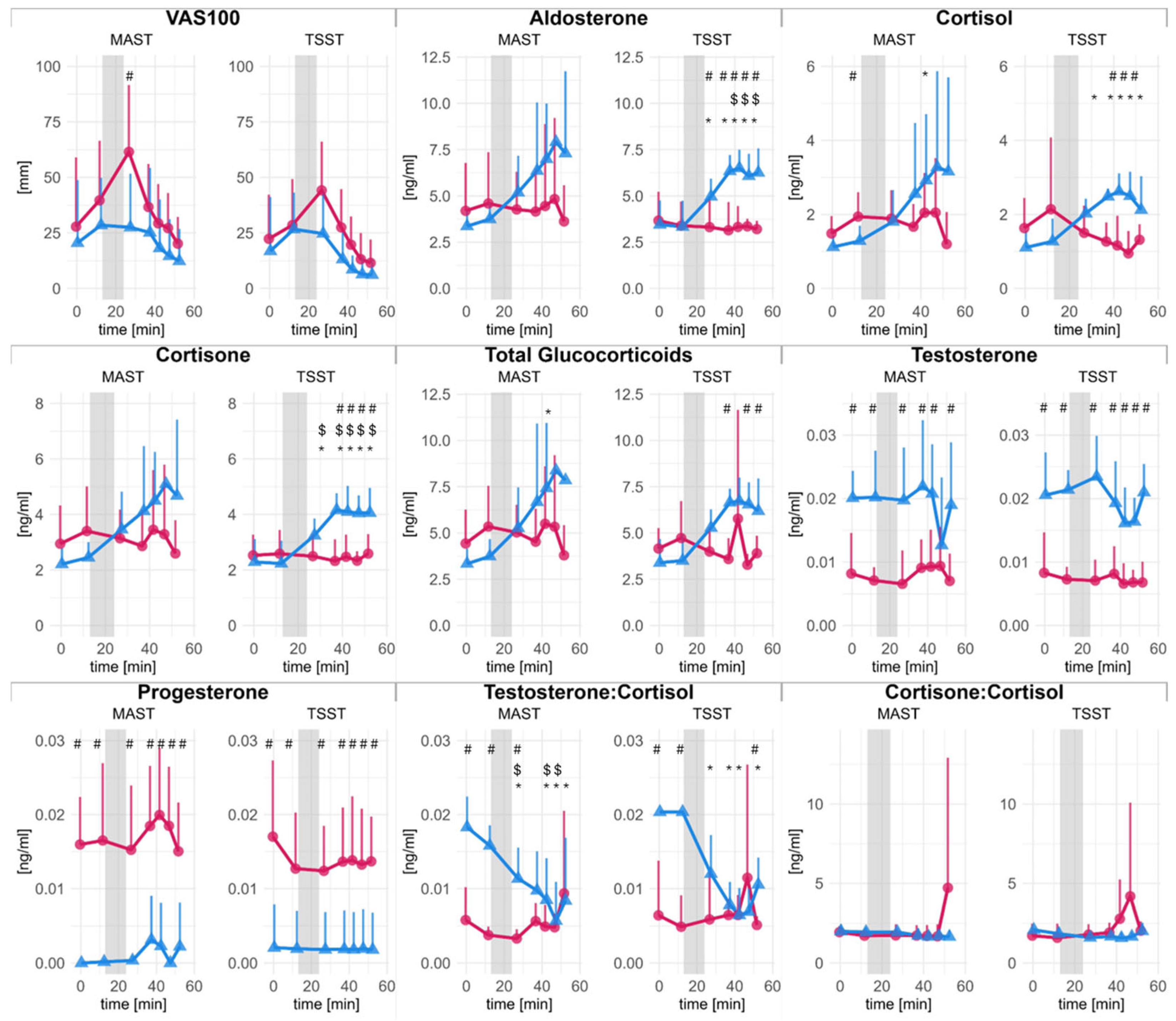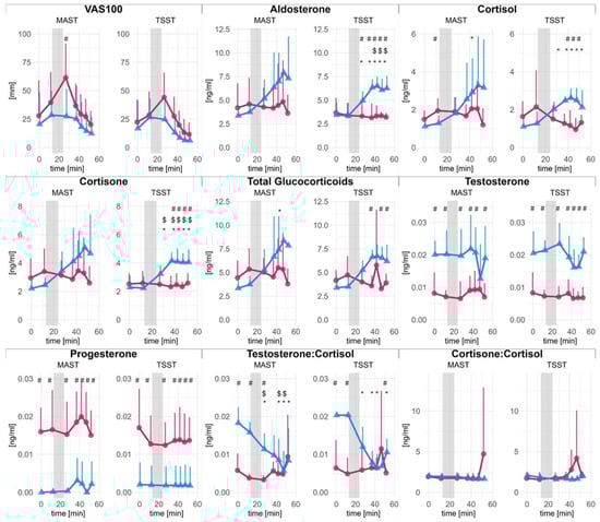 - Liu, J.J.W.; Ein, N.; Peck, K.; Huang, V.; Pruessner, J.C.; Vickers, K. Sex Differences in Salivary Cortisol Reactivity to the Trier Social Stress Test (TSST): A Meta-Analysis. Psychoneuroendocrinology 2017, 82, 26–37. [Google Scholar] [CrossRef]