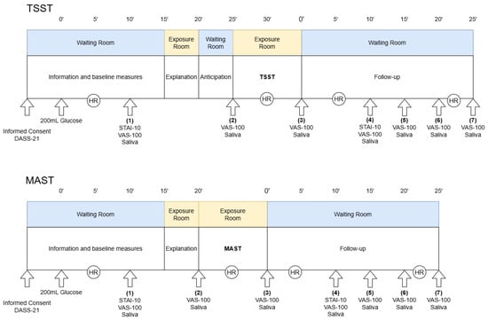 - Smeets, T.; Cornelisse, S.; Quaedflieg, C.W.E.M.; Meyer, T.; Jelicic, M.; Merckelbach, H. Introducing the Maastricht Acute Stress Test (MAST): A Quick and Non-Invasive Approach to Elicit Robust Autonomic and Glucocorticoid Stress Responses. Psychoneuroendocrinology 2012, 37, 1998–2008. [Google Scholar] [CrossRef]