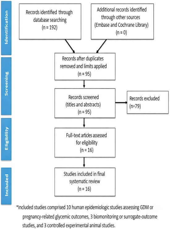 Titles and abstracts were screened. After duplicates were removed, 16 studies met the inclusion criteria (10 human epidemiologic studies assessing GDM or pregnancy-related glycemic outcomes, 3 biomonitoring or surrogate-outcome studies, and 3 controlled experimental animal studies) (Figure 1)