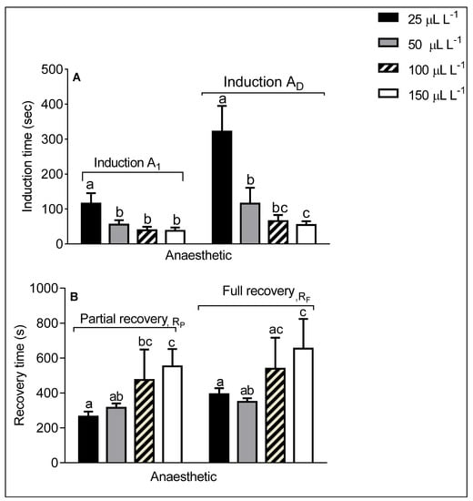 Induction (A1 and AD) (A) and recovery (RP and RF) (B) time in Mozambique tilapia (Oreochromis mossambicus) subjected to different concentrations of oregano (OEO). Values are given as mean ± standard error (N = 9), and different lowercase letters indicate significant differences between treatment groups. Values were subjected to one-way ANOVA and Tukey’s multiple comparison test to determine the significant differences between each anaesthetic stage and OEO concentrations at the p < 0.05 significance level.