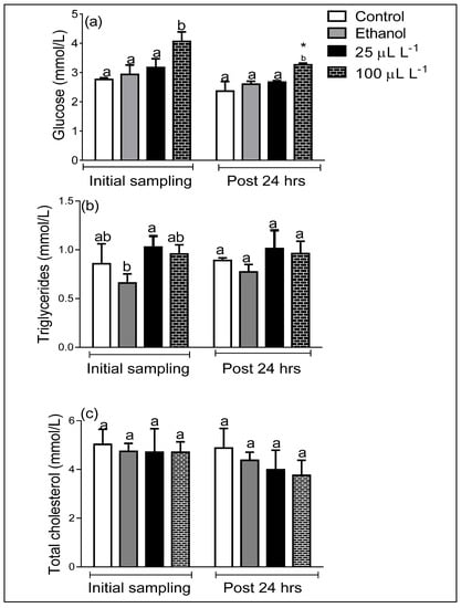 Blood glucose (a), triglycerides (b), and total cholesterol (c) of Mozambique tilapia (Oreochromis mossambicus) subjected to two oregano concentrations (25 and 100 µL L−1), ethanol, and a control (water only). These parameters were sampled at 0 h and after 24 h. Values are given as mean ± standard error (N = 3), and different lowercase letters indicate significant differences between treatment groups within a sampling time (0 h or 24 h) using one-way ANOVA and Tukey’s multiple comparison test. The asterisks indicate a significant difference of the treatment group from other groups after 24 h (p < 0.05).
