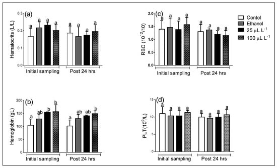 Hematocrits (a), hemoglobin (b), RBC (c), and PLT (d) of Mozambique tilapia (Oreochromis mossambicus) subjected to two oregano concentrations (25 and 100 µL L−1), ethanol, and a control (water only). These parameters were sampled at 0 h and after 24 h. Values are given as mean ± standard error (N = 3), and different lowercase letters indicate significant differences between treatment groups within a sampling time (0 h or 24 h) using one-way ANOVA and Tukey’s multiple comparison test.