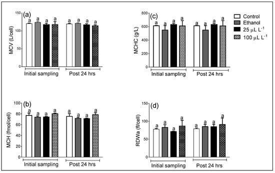MCV (a), MCH (b), MCHC (c), and RDWa (d) of Mozambique tilapia (Oreochromis mossambicus) subjected to two oregano concentrations (25 and 100 µL L−1), ethanol, and a control (water only). These parameters were sampled at 0 h and after 24 h. Values are given as mean ± standard error (N = 3), and different lowercase letters indicate significant differences between treatment groups within a sampling time (0 h or 24 h) using one-way ANOVA and Tukey’s multiple comparison test.
