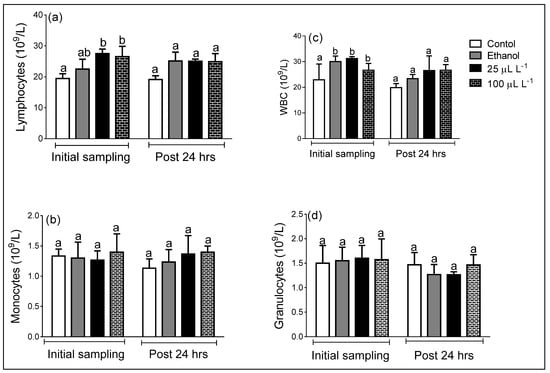 Lymphocytes (a), monocytes (b), WBC (c), and granulocytes (d) of Mozambique tilapia (Oreochromis mossambicus) subjected to two oregano concentrations (25 and 100 µL L−1), ethanol, and a control (water only), respectively. These parameters were sampled at 0 h and after 24 h. Values are given as mean ± standard error (N = 3), and different lowercase letters indicate significant differences between treatment groups within a sampling time (0 h or 24 h) using one-way ANOVA and Tukey’s multiple comparison test.