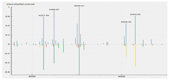 MALDI-TOF spectrum of the ribosomal protein fragments of the Aeromonas veronii DFR01 mass cultivated in beef extract–peptone–glucose (BPG) broth media. A direct smear method of a bacterial colony was performed. The spectra of six (6) replicates gave an average identification score of 2.32 ± 0.12.