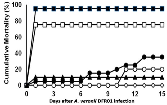 Cumulative mortalities of tilapia juveniles (ABW: 6 ± 0.5 g; n = 20 fish/inoculum dose) experimentally infected by intraperitoneal injection with A. veronii DFR01. (■) 109.8 CFU/fish; (□) 108.8 CFU/fish; (●) 107.8 CFU/fish; (○) 106.8 CFU/fish; (▲) 105.8 CFU/fish; (◊) control (NSS buffer only).