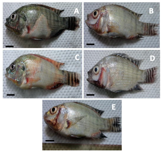 Gross clinical signs of motile aeromonad septicemia infection observed in diseased Nile tilapia (O. niloticus) infected with A. veronii DFR01 through intraperitoneal injection: (A) discolored or bleached skin at the abdominal area, (B) depressed abdominal cavity and caudal fin rot, (C) hyperemia at the bases of pectoral and dorsal fins, (D) hemorrhagic areas in the operculum and loss of scales around the base of the dorsal fins, and (E) skin lesions at the base of the pelvic fins (bar = 1 cm).
