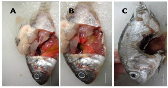 Gross clinical signs of MAS infection were observed, such as discoloration or bleaching of the skin (Figure 5A–D) and hyperemia or blood build up in the vascular tissues of the operculum (Figure 5B,D,E), in the radials of the pectoral fin (Figure 5A,C), and at the base of the dorsal and pelvic fins (Figure 5C). Moreover, swollen abdomen (Figure 5A), corneal opacity (Figure 6A,B), and caudal fin rot (Figure 5A and Figure 6C) were also documented. In severe cases, a ruptured abdominal wall (Figure 6C) was also observed in some diseased fish samples. Gross internal clinical pathologies that were observed include ascites (Figure 6A,B), pale liver with patches of greenish coloration (Figure 6A,B), and bloody fluid in the visceral organs (Figure 6A,B). Infected moribund fish displayed erratic swimming while others became lethargic. Infected fish died within two days post-infection (Figure 6C). Mortalities were seen within 18 h after injection. Bacterial isolates were re-isolated from the infected fish; the re-isolation rate from the kidneys is indicated in Table S5.