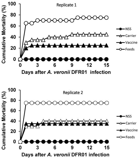 Cumulative mortalities of the different groups of tilapia juveniles intraperitoneally challenged with A. veronii DFR01 at a dose of 107 CFU/mL for replicates 1 and 2. Carrier group: 45% and 40%; Vaccine group: 25% and 35%; Control (Non-vaccinated)—challenged group: 75%; Control (NSS)—mock challenged: 0%.